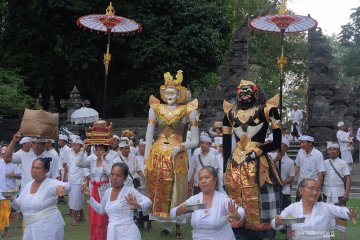 Umat Hindu membawa benda-benda sakral dalam tradisi Mapeed di Pura Alas Kedaton, Tabanan, Bali, Selasa (13/8/2019). Tradisi yang digelar setiap enam bulan sekali tersebut merupakan rangkaian upacara persembahyangan di pura yang terletak di dalam areal obyek wisata Alas Kedaton. ANTARA FOTO/Nyoman Hendra Wibowo/aww.
