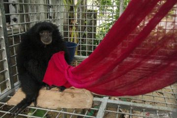 Seekor Siamang atau Kera Hitam (Symphalangus syndactylus) berada di kandang penangkaran usai diserahkan warga di kantor Balai Konservasi Sumber Daya Alam (BKSDA) Wilayah I Lhokseumawe, Aceh, Selasa (13/8/2019). BKSDA menerima satwa dilindungi berjenis kelamin betina dan berusia empat tahun tersebut dari warga yang secara sukarela menyerahkan untuk direhabilitasi dan dilepasliarkan kembali ke habitatnya. ANTARA FOTO/Rahmad/aww.