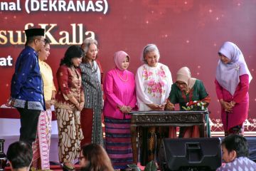 Ketua Umum Dewan Kerajinan Nasional Mufidah Jusuf Kalla (kedua kanan) disaksikan Ketua Dewan Kerajinan Daerah (Dekranasda) NTB Niken Saptarini Widyawati (kanan) serta Gubernur NTB Zulkieflimansyah (kiri) menandatangani prasasti saat meresmikan gedung Dekranasda NTB di Mataram, Rabu (14/8/2019). Selain meresmikan gedung Dekranasda NTB, Ibu Mufidah Jusuf Kalla juga melalukan dialog dengan pelaku UMKM sekaligus mendorong pelaku UMKM melakukan inovasi agar bisa bersaing secara global. ANTARA FOTO/Ahmad Subaidi/hp.