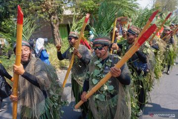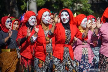 Sejumlah peserta mengikuti karnaval kemerdekaan di Ringinpitu, Sragi, Kabupaten Pekalongan, Jawa Tengah, Minggu (18/8/2019). Menurut panitia setempat, selain dalam rangka memperingati HUT ke-74 Kemerdekaan RI karnaval tersebut juga wujud mengkampanyekan penggunaan barang-barang limbah dan tanaman menjadi barang berdaya guna. ANTARA FOTO/Harviyan Perdana Putra/hp.