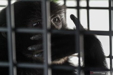 Seekor Siamang atau Kera Hitam (Symphalangus syndactylus) betina berada di kandang penangkaran mobil bak terbuka saat akan dievakuasi dari kantor Balai Konservasi Sumber Daya Alam (BKSDA) Wilayah I Lhokseumawe, Aceh, Jumat (23/8/2019). BKSDA Aceh mengevakuasi Siamang serahan sukarela warga untuk dilepasliarkan kembali ke habitatnya di hutan Taman Rusa Kabupaten Aceh Besar, Provinsi Aceh. ANTARA FOTO/Rahmad/foc.