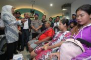 Gubernur Jawa Timur Khofifah Indar Parawansa (kiri) menemui korban kapal terbakar KM Santika Nusantara di Gapura Surya Nusantara, Pelabuhan Tanjung Perak, Surabaya, Jawa Timur, Sabtu (24/8/2019). Sebanyak 53 penumpang selamat tiba di Surabaya dengan Kapal KN Chundamani P 116. Kapal tersebut juga membawa tiga jenazah korban meninggal dunia dari Pulau Masalembo. ANTARA FOTO/Didik Suhartono/wsj.