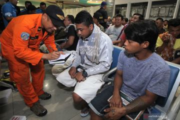 Petugas mendata korban selamat kapal terbakar KM Santika Nusantara setelah turun dari kapal KN Chundamani P 116 di Gapura Surya Nusantara, Pelabuhan Tanjung Perak, Surabaya, Jawa Timur, Sabtu (24/8/2019). Sebanyak 53 penumpang selamat tiba di Surabaya dengan Kapal KN Chundamani P 116. Kapal tersebut juga membawa tiga jenazah korban meninggal dunia dari Pulau Masalembo. ANTARA FOTO/Didik Suhartono/wsj.