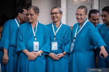 Wakil Ketua KPK Alexander Marwata (ketiga kiri) berbincang dengan capim KPK lainya saat bersiap mengikuti tes kesehatan Calon Pimpinan Komisi Pemberantasan Korupsi (Capim KPK) di RSPAD Gatot Soebroto, Jakarta, Senin (26/8/2019). Sebanyak 20 orang yang dinyatakan lolos dalam tes "profile assessment" Capim KPK masa jabatan 2019-2023 mengikuti tes kesehatan tersebut. ANTARA FOTO/Aprillio Akbar/pras.