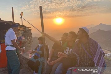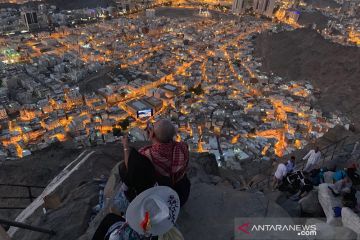 Sejumlah pengunjung mengabadikan momen saat matahari terbit di puncak Jabal Nur dengan latar Kota Mekkah, Senin (26/8/2019). Jabal Nur menjadi tempat wisata ziarah yang paling diminati karena terdapat Gua Hira di puncaknya sebagai tempat Nabi Muhammad menerima wahyu yang pertama. ANTARA/Hanni Sofia/am.