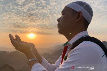 Seorang pengunjung memanjatkan doa saat matahari terbit di puncak Jabal Nur, Senin (26/8/2019). Jabal Nur menjadi tempat wisata ziarah yang paling diminati karena terdapat Gua Hira di puncaknya sebagai tempat Nabi Muhammad menerima wahyu yang pertama. ANTARA/Hanni Sofia/am.