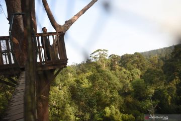 Wisatawan menikmati pemandangan dari atas Canopy Bridge Bukit Bangkirai, Kecamatan Samboja, Kutai Kartanegara, Kalimantan Timur, Kamis (29/8/2019). Lokasi wisata yang memiliki luas sekitar 1.500 hektar itu menawarkan pemandangan alam hutan hujan tropis di kawasan yang akan menjadi ibu kota negara baru. ANTARA FOTO/Akbar Nugroho Gumay/wsj.