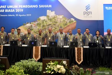 Direktur Utama PT Perusahaan Gas Negara Tbk (PGN) Gigih Prakoso Soewarto (keenam kanan), Komisaris Utama IGN Wiramaja Puja (keenam kiri) bersama komisaris dan direksi PGN mengikuti Rapat Umum Pemegang Saham Luar Biasa (RUPSLB) PGN di Jakarta, Jumat (30/8/2019). RUPSLB tersebut beragendakan perombakan direksi dan komisaris PGN. ANTARA FOTO/Wahyu Putro A/hp.