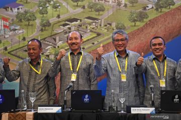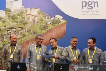 Direktur Utama PT Perusahaan Gas Negara Tbk (PGN) Gigih Prakoso Soewarto (tengah) bersama Komisaris Utama IGN Wiramaja Puja (kiri) dan Direktur Keuangan Said Reza Pahlevy mengikuti Rapat Umum Pemegang Saham Luar Biasa (RUPSLB) PGN di Jakarta, Jumat (30/8/2019). RUPSLB tersebut beragendakan perombakan direksi dan komisaris PGN. ANTARA FOTO/Wahyu Putro A/hp.