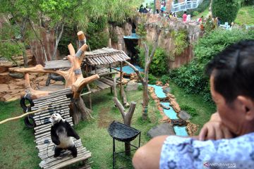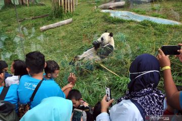 Pengunjung menyaksikan Giant Panda (Ailuropoda melanoleuca) diberi makan tambahan di Istana Panda Indonesia, Taman Safari Indonesia (TSI), Cisarua, Kabupaten Bogor, Jawa Barat, Sabtu (31/8/2019). Wisata Istana Panda TSI menjadi tempat favorit bagi pengunjung dalam mengisi libur akhir pekan yang bertepatan dengan Tahun Baru Islam 1 Muharram 1441 Hijriyah. ANTARA FOTO/Arif Firmansyah/hp.