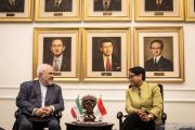 Menteri Luar Negeri Retno Marsudi (kanan) menerima kunjungan Menteri Luar Negeri Iran Mohammad Javad Zarif (kiri) di Gedung Pancasila, Kementerian Luar Negeri, Jakarta, Jumat (6/9/2019). Pertemuan kedua menteri tersebut untuk meningkatkan kerja sama antara kedua negara. ANTARA FOTO/Aprillio Akbar/hp.