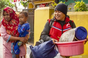 Petugas membantu mengangkut barang rumah tangga milik warga terdampak tumpahan minyak mentah di Desa Cemarajaya, Cibuaya, Karawang, Jawa Barat, Kamis (12/9/2019). Pertamina Hulu Energi Offshore North West Java melakukan relokasi bertahap kepada warga yang bertempat tinggal sekitar 20 meter dari bibir pantai ke hunian sementara untuk mencegah dampak tumpahan minyak mentah pada kesehatan masyarakat di pesisir pantai Karawang. ANTARA FOTO/M Ibnu Chazar/aww.