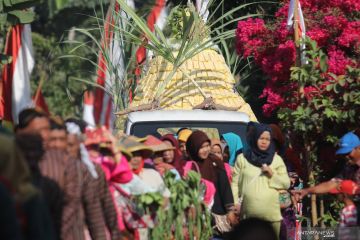 Warga mengarak gunungan berisi tahu takwa khas Kediri di Desa Toyoresmi, Kediri, Jawa Timur, Jumat (13/9/2019). Bersih desa pada bulan Suro penanggalan Jawa tersebut sebagai perwujudan rasa syukur kepada Tuhan Yang Maha Esa sekaligus mempromosikan desa Toyoremi sebagai sentral perajin tahu takwa. ANTARA FOTO/Prasetia Fauzani/hp.