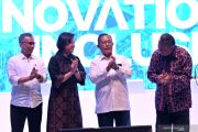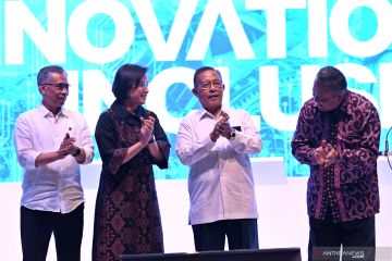 Menteri Koordinator Bidang Perekonomian Darmin Nasution (kedua kanan), Menteri Keuangan Sri Mulyani Indrawati (kedua kiri), Ketua Dewan Komisioner Otoritas Jasa Keuangan ( OJK) Wimboh Santoso (kiri) dan Gubernur Bank Indonesia (BI) Perry Warjiyo membuka Indonesia Fintech Summit & Expo 2019 di Jakarta Convention Center (JCC), Jakarta, Senin (23/9/2019). Konferensi dan Pameran bertema Inovasi untuk Inklusi tersebut melibatkan sekitar 100 pelaku industri 'fintech' dan berlangsung 23 -24 September 2019. ANTARA FOTO/Aditya Pradana Putra/pras.