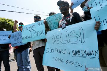 Sejumlah jurnalis berunjuk rasa di depan gedung DPRD Kota Blitar, Jawa Timur, Rabu (25/9/2019). Jurnalis yang tergabung di PWI dan IJTI menuntut Kapolri untuk menindak tegas oknum polisi yang melakukan kekerasan terhadap wartawan yang meliput aksi demonstrasi mahasiswa di Makassar, serta meminta pemerintah menghapus RUU KUHP yang dinilai bakal mengancam kebebasan Pers dan bertentangan dengan UU Nomor 40 Tahun 1999 tentang Pers. ANTARA FOTO/Irfan Anshori/hp.