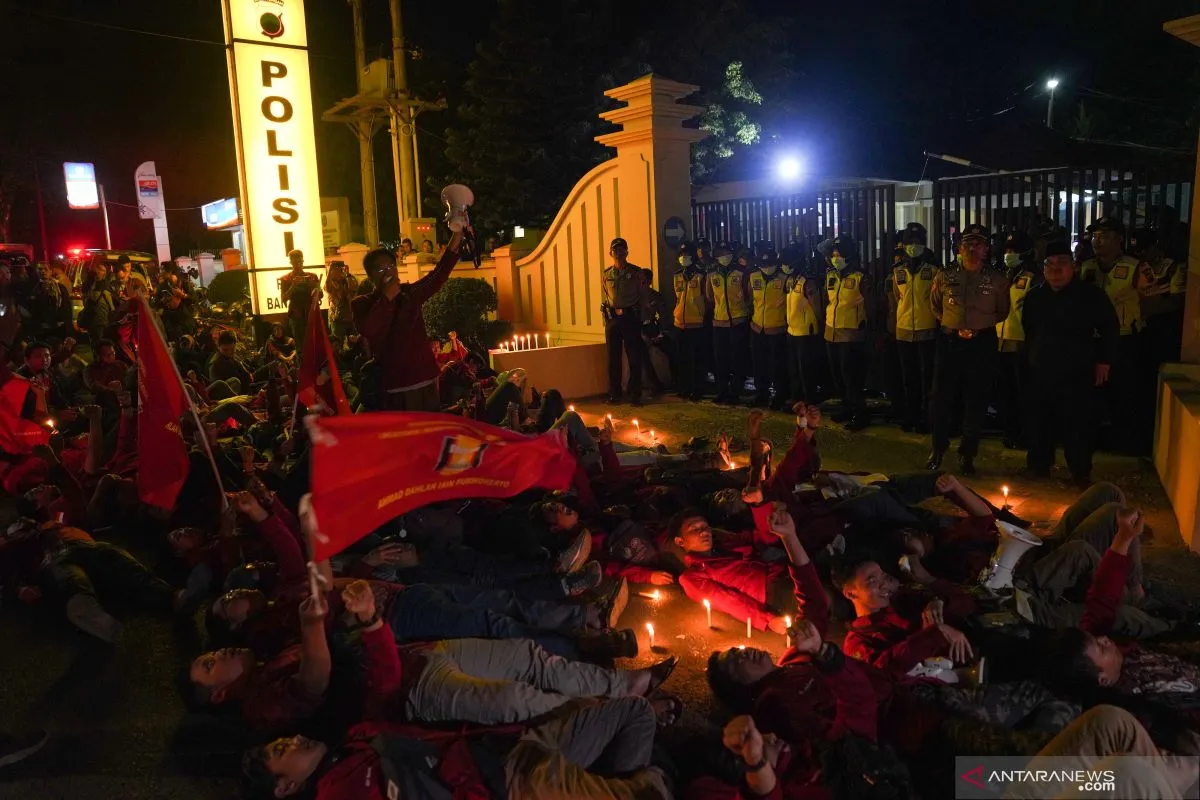 Sejumlah mahasiswa yang tergabung dalam Jaringan Kader dan Alumni Ikatan Mahasiswa Muhammadiyah (IMM) Banyumas Raya melakukan aksi solidaritas mengecam tewasnya kader IMM yang terjadi di Kendari, di depan Polres Banyumas, Jawa Tengah, Kamis (26/9/2019). Mereka menuntut Kapolri untuk memimpin langsung proses investigasi serta menindak tegas oknum kepolisian yang bertindak represif dan menuntut Presiden Joko Widodo untuk mengeluarkan Perppu UU KPK. ANTARA FOTO/Idhad Zakaria/wsj.