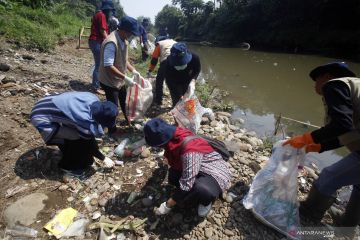 Sejumlah aktivis lingkungan memungut sampah plastik yang nantinya diolah menjadi bahan bakar pada sosialisasi pengolahan sampah plastik di Bogor, Jawa Barat, Selasa (1/10/2019). Komunitas Get Plastic dengan Komunitas Peduli Ciliwung (KPC) serta didukung oleh European Union melakukan antisipasi permasalahan sampah plastik di sungai dengan sosialisasi sampah plastik diolah menjadi Bahan Bakar Minyak (BBM) dan gas. ANTARA FOTO/Yulius Satria Wijaya/pras.