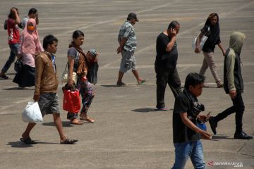Sejumlah pengungsi berjalan di Landasan Udara (Lanud) Hasanuddin, Kabupaten Maros, Sulawesi Selatan, Rabu (2/10/2019). Sebanyak 170 pengungsi asal Sulawesi Selatan dan Malang tiba di Landasan Hasanuddin dan kembali ke daerah asal masing-masing pascakerusuhan di Wamena, Papua yang mengakibatkan 33 orang meninggal dunia. ANTARA FOTO/Abriawan Abhe/ama.