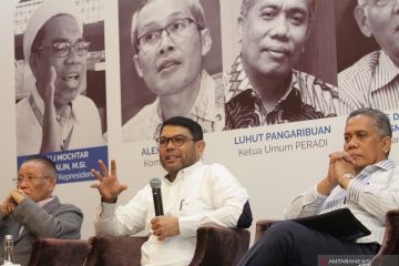 Anggota DPR Fraksi PKS Nasir Jamil (tengah) bersama Guru Besar Ilmu Hukum Universitas Padjajaran Romli Atmasasmita (kiri) dan Ketua Umum Peradi Luhut Pangaribuan (kanan) menjadi pembicara dalam Diskusi Sikap Pemerintah Terhadap UU KPK di Jakarta, Jumat (4/10/2019). Diskusi yg dihadiri pengamat, praktisi hukum, perwakilan partai dan masyarakat umum ini ingin memberikan masukan kepada pemerintah atas UU KPK yang telah disetujui oleh DPR. ANTARA FOTO/Reno Esnir/nz.