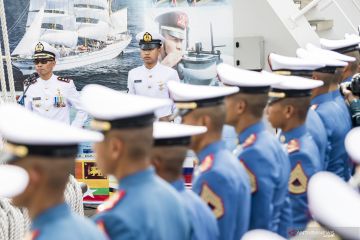 Taruna AAL tingkat III angkatan ke-66 mengikuti upacara HUT Ke-74 TNI di geladak KRI Bima Suci, Myanmar International Terminal Thilawa, Myanmar, Sabtu (5/10/2019). ANTARA FOTO/M Agung Rajasa/wsj.