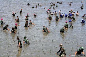 Anggota TNI menanam mangrove di Kecamatan Biringkanaya, Makassar, Sulawesi Selatan, Senin (7/10/2019). Penanaman mangrove sebanyak 300.074 pohon yang dilaksanakan serentak di sejumlah daerah di Indonesia tersebut diikuti oleh anggota TNI, Polri dan sejumlah instansi serta masyarakat setempat sebagai rangkaian perayaan HUT TNI ke-74 sekaligus menjadi upaya pencegahan abrasi di wilayah pesisir. ANTARA FOTO/Arnas Padda/YU/hp.