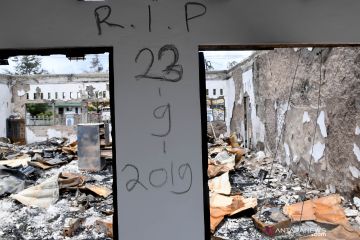 Suasana ruang kantor yang hangus terbakar akibat aksi anarkis di Kantor Bupati Jayawijaya, Wamena, Papua, Rabu (9/10/2019). Sejumlah bangunan kantor, rumah, toko, hingga kendaraan rusak terbakar pascaaksi unjuk rasa yang berujung anarkis pada 23 September 2019 lalu hingga menyebabkan 33 orang meninggal dunia dan 76 orang luka-luka. ANTARA FOTO/M Risyal Hidayat/foc.