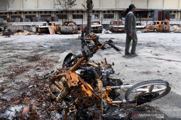 Warga melintas di antara bangkai mobil dan sepeda motor yang hangus terbakar di Kantor Bupati Jayawijaya, Wamena, Papua, Rabu (9/10/2019). Sejumlah bangunan kantor, rumah, toko, hingga kendaraan rusak terbakar pascaaksi unjuk rasa yang berujung anarkis pada 23 September 2019 lalu hingga menyebabkan 33 orang meninggal dunia dan 76 orang luka-luka. ANTARA FOTO/M Risyal Hidayat/foc.