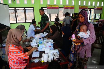Petugas kesehatan melayani warga dalam pengobatan gratis di Desa Tedunan, Wedung, Demak, Jawa Tengah, Rabu (9/10/2019). Pengobatan gratis oleh TNI dengan dinas kesehatan setempat itu merupakan bagian dari kegiatan bakti sosial yang digelar Kodim 0716/Demak dalam rangka HUT TNI ke-74 untuk membantu warga kurang mampu. ANTARA FOTO/Yusuf Nugroho/ama.