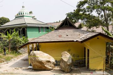 Sejumlah bongkahan batu sebesar sekitar 6x5 meter menimpa bangunan di Kampung Cihandeuleum, Desa Sukamulya, Tegalwaru, Purwakarta, Jawa Barat, Rabu (9/10/2019). Sedikitnya enam rumah dan satu bangunan sekolah rusak akibat peristiwa longsoran batu tersebut yang diduga akibat aktivitas blasting atau peledakan batu oleh sebuah perusahaan penambangan pada Selasa (8/10/2019). ANTARA FOTO/M Luthfi Rahman/mic/ama.