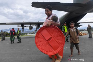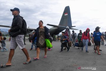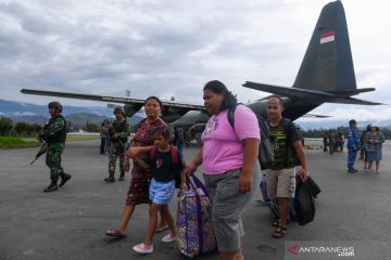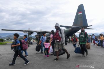 Pengungsi berjalan menuruni pesawat Hercules TNI AU ketika tiba di Bandar Udara Wamena, Kabupaten Jayawijaya, Papua, Kamis (10/10/2019). Sebanyak 88 pengungsi yang didominasi warga asal Sumatera Utara kembali ke Wamena setelah eksodus ke Jayapura pascaaksi unjuk rasa yang berujung anarkis pada 23 September 2019 lalu. ANTARA FOTO/M Risyal Hidayat/hp.