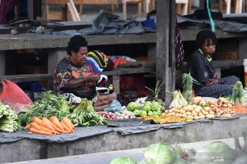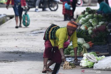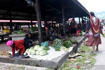Sejumlah pedagang berjualan di Pasar Tradisional Tolikelek, Kota Wamena, Kabupaten Jayawijaya, Papua, Kamis (10/10/2019). Pasca kerusuhan pada 23 September 2019, kini kondisi Wamena mulai aman dan kondusif, aktivitas sekolah, pasar tradisional dan pelayanan pemerintahan mulai kembali normal. ANTARA FOTO/M Risyal Hidayat/hp.