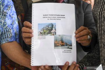 Perwakilan Forum Lintas Paguyuban se Papua memperlihatkan peryataan sikap yang akan diserahkan ke Komnas HAM di Jakarta, Jumat (11/10/2019). Perwakilan Forum Lintas Paguyuban se Papua yang juga menjadi korban kerusuhan di Wamena mendesak Komnas HAM untuk turun tangan menyelesaikan kerusuhan yang terjadi di Wamena beberapa waktu yang lalu. ANTARA FOTO/Nova Wahyudi/hp.