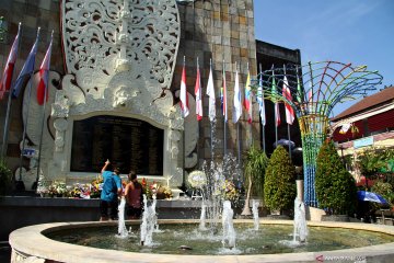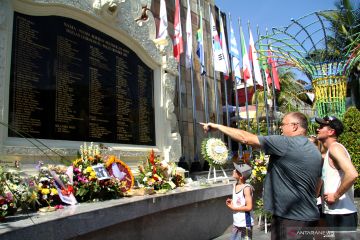 Wisatawan asing mengamati nama-nama korban saat mengunjungi monumen peristiwa peledakan bom Bali, di kawasan Legian Kuta, Bali, Sabtu (12/10/2019). Peringatan 17 tahun Bom Bali yang biasa diperingati dengan peletakan karangan bunga serta malam renungan tersebut untuk mengenang para korban pada peristiwa 12 Oktober 2002. ANTARA FOTO/Risky Andrianto/aww.