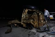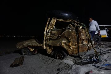 Warga melihat bangkai mobil yang terseret gelombang tsunami dan berhasil dievakuasi dari dalam laut di Pantai Kelurahan Tondo, Palu, Sulawesi Tengah, Sabtu (12/10/2019). Setahun usai dilanda bencana gempa dan tsunami pada 28 September 2018, sejumlah barang milik korban yang terseret ke dalam laut kembali ditemukan. ANTARA FOTO/Mohamad Hamzah/hp.