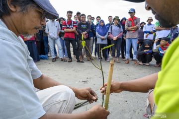 Sejumlah mahasiswa dan pecinta lingkungan memerhatikan penjelasan tentang tata cara membudidayakan mangrove di Palu, Sulawesi Tengah, Minggu (13/10/2019). Edukasi yang diinisiasi oleh Mangrovers Kota Palu itu untuk memberikan pengetahuan dasar tentang budidaya mangrove yang saat ini masif dilakukan di pesisir pantai Teluk Palu yang rusak akibat tsunami setahun lalu. ANTARA FOTO/Basri Marzuki/hp.