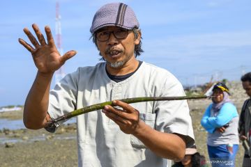 Ketua Relawan Mangrove Tomini (Remot) Hamzah Tjakunu memberikan penjelasan tentang tata cara membudidayakan mangrove kepada sejumlah mahasiswa dan pecinta lingkungan di Palu, Sulawesi Tengah, Minggu (13/10/2019). Edukasi yang diinisiasi oleh Mangrovers Kota Palu itu untuk memberikan pengetahuan dasar tentang budidaya mangrove yang saat ini masif dilakukan di pesisir pantai Teluk Palu yang rusak akibat tsunami setahun lalu. ANTARA FOTO/Basri Marzuki/hp.