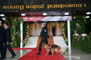 Paspampres melakukan sterilisasi dengan anjing pelacak jelang pelantikan presiden dan wapres masa jabatan 2019-2024 Joko Widodo dan Ma'ruf Amin di Gedung Nusantara, kompleks Parlemen, Senayan, Jakarta, Minggu (20/10/2019). ANTARA FOTO/Sigid Kurniawan/pras.