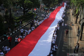 Polisi dan warga mengikuti Parade Merah Putih Indonesia Damai di Jalan Darmo, Surabaya, Jawa Timur, Minggu (20/10/2019). Kegiatan dengan kirab Bendera Merah Putih sepanjang 210 meter itu digelar untuk menjaga dan merawat kebhinekaan yang ada di Indonesia. ANTARA FOTO/Didik Suhartono/pras.