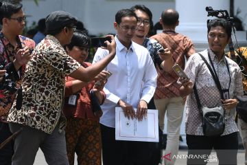 Pendiri Gojek Nadiem Makarim melambaikan tangannya saat berjalan memasuki Kompleks Istana Kepresidenan, Jakarta, Senin (21/10/2019). Menurut rencana, Presiden Joko Widodo akan memperkenalkan jajaran kabinet barunya hari ini usai dilantik Minggu (20/10/2019) kemarin untuk masa jabatan keduanya periode tahun 2019-2024 bersama Wapres Ma'ruf Amin. ANTARA FOTO/Wahyu Putro A/aww.