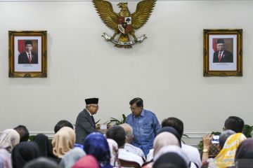 Wakil Presiden Ma'ruf Amin (kiri) bersama Wakil Presiden ke-10 dan ke-12 RI Jusuf Kalla (kanan) menghadiri acara penyerahan memori jabatan Wakil Presiden di Istana Wakil Presiden, Jakarta, Senin (21/10/2019). Wakil Presiden Ma'ruf Amin menerima memori jabatan Wakil Presiden dari mantan Wapres Jusuf Kalla sebagai tanda keberlanjutan tugas-tugas Wakil Presiden. ANTARAFOTO/Galih Pradipta/aww.