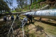 Seorang anggota kepolisian berusaha melewati pohon tumbang akibat bencana angin ribut yang terjadi di Pangalengan, Kabupaten Bandung, Jawa Barat, Senin (21/10/2019). Badan Meteorologi Klimatologi Geofisika (BMKG) menyebutkan fenomena angin ribut yang menghancurkan ratusan atap rumah hancur dan pohon tumbang di Pangalengan tersebut diakibatkan oleh peralihan dari musim kemarau ke musim hujan. ANTARA FOTO/Raisan Al Farisi/hp.