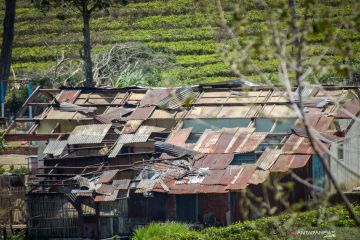 Kondisi atap rumah warga yang terlepas akibat bencana angin ribut yang terjadi di Pangalengan, Kabupaten Bandung, Jawa Barat, Senin (21/10/2019). Badan Meteorologi Klimatologi Geofisika (BMKG) menyebutkan fenomena angin ribut yang menghancurkan ratusan atap rumah hancur dan pohon tumbang di Pangalengan tersebut diakibatkan oleh peralihan dari musim kemarau ke musim hujan. ANTARA FOTO/Raisan Al Farisi/hp.