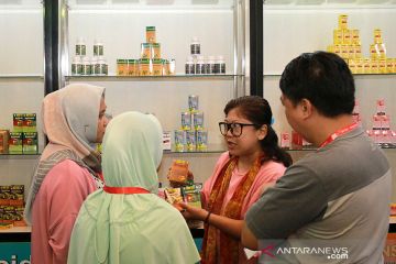 Tenaga penjual menjelaskan produk obat herbal asli Indonesia kepada pengunjung di Trade Expo Indonesia Ke- 34 di ICE Serpong, Tangerang, Banten, Minggu (20/10/2019). Produk herbal PT. Dami Sariwarna itu telah diekspor ke Arab Saudi, Nigeria dan Singapura. ANTARA FOTO/Muhammad Iqbal/spt/pri.