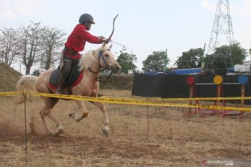 Peserta membidik sasaran dalam Lomba Panahan Berkuda di Lapangan Paramon, Batu, Jawa Timur, Minggu (27/10/2019). Lomba yang diikuti puluhan peserta dari berbagai daerah tersebut menilai ketrampilan, kecepatan sekaligus ketepatan penunggang kuda dalam memanah sasaran. ANTARA FOTO/Ari Bowo Sucipto/aww
