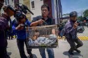 Petugas membawa seekor Lutung Jawa (Trachypithecus auratus) untuk dihadirkan pada gelar perkara tindak pidana kasus perdagangan satwa dilindungi di Polda Jabar, Bandung, Jawa Barat, Senin (28/10/2019). Polda Jabar bekerja sama dengan BKSDA berhasil menyelamatkan enam ekor lutung jawa, dua ekor surili (Presbytis), satu ekor owa jawa (Hylobates moloch), dan satu ekor monyet ekor panjang (Macaca fascicularis) dari tersangka berinisial D yang diancam hukuman 5 tahun penjara. ANTARA FOTO/Raisan Al Farisi/hp.