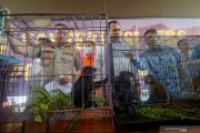 Sejumlah Lutung Jawa (Trachypithecus auratus) dihadirkan saat gelar perkara tindak pidana kasus perdagangan satwa dilindungi di Polda Jabar, Bandung, Jawa Barat, Senin (28/10/2019). Polda Jabar bekerja sama dengan BKSDA berhasil menyelamatkan enam ekor lutung jawa, dua ekor surili (Presbytis), satu ekor owa jawa (Hylobates moloch), dan satu ekor monyet ekor panjang (Macaca fascicularis) dari tersangka berinisial D yang diancam hukuman 5 tahun penjara. ANTARA FOTO/Raisan Al Farisi/hp.