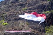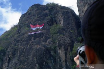Sejumlah pemanjat memasang bendera raksasa berukuran 30 x 20 meter di tebing Gunung Spikul, Trenggalek, Jawa Timur, Senin (28/10/2019). Pengibaran bendera raksasa di ketinggian sekitar 380 meter di atas permukaan tanah, itu dilakukan komunitas Federasi Pemanjat Tebing Indonesia (FPTI) dan diikuti seluruh perwakilan mahasiswa pecinta alam dari berbagai daerah di Indonesia dalam rangka peringatan Hari Sumpah Pemuda ke-91. ANTARA FOTO/Destyan Sujarwoko/hp.