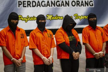 Sejumlah tersangka dihadirkan saat pengungkapan kasus Tindak Pidana Perdagangan Orang (TPPO) di Bareskrim, Mabes Polri, Jakarta, Selasa (29/10/2019). Direktorat Tindak Pidana Umum Bareskrim Polri menggagalkan pemberangkatan 48 Warga Negara Indonesia (WNI) yang akan dijadikan pekerja migran di wilayah Timur Tengah secara ilegal dengan barang bukti 25 paspor, 25 visa dan 25 tiket elektronik. ANTARA FOTO/Dhemas Reviyanto/ama.