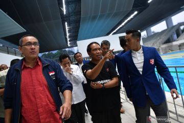 Menpora Zainudin Amali (kedua kanan) berbincang dengan Ketua Umum PB PRSI Anindya Novyan Bakrie (kanan) dan Chief de Mission SEA Games 2019 Harry Warganegara (kiri) saat meninjau pelatnas renang SEA Games 2019 di Stadion Akuatik, kompleks GBK, Jakarta, Selasa (5/11/2019). Menpora Zainudin Amali berharap Timnas Renang Indonesia dapat membawa setidaknya empat medali emas dalam SEA Games 2019 di Filipina mendatang. ANTARA FOTO/Sigid Kurniawan/foc.