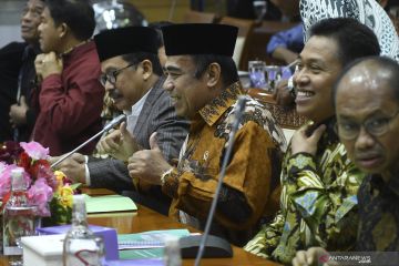 Menteri Agama Fachrul Razi (tengah) mengikuti rapat kerja dengan Komisi VIII DPR di Kompleks Parlemen, Senayan, Jakarta, Kamis (7/11/2019). Rapat kerja tersebut membahas evaluasi program dan rencana program prioritas di Kementerian Agama tahun 2020. ANTARA FOTO/Nova Wahyudi/hp.